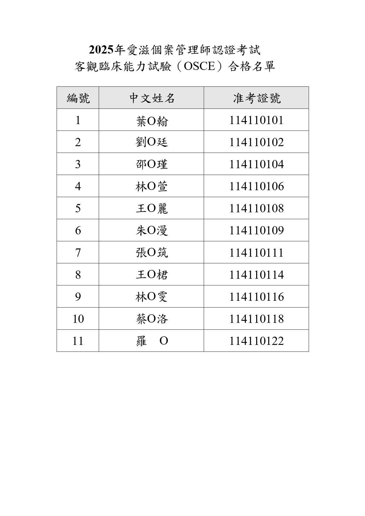 【客觀臨床能力試驗(OSCE)合格名單】2025年愛滋個案管理師認證考試