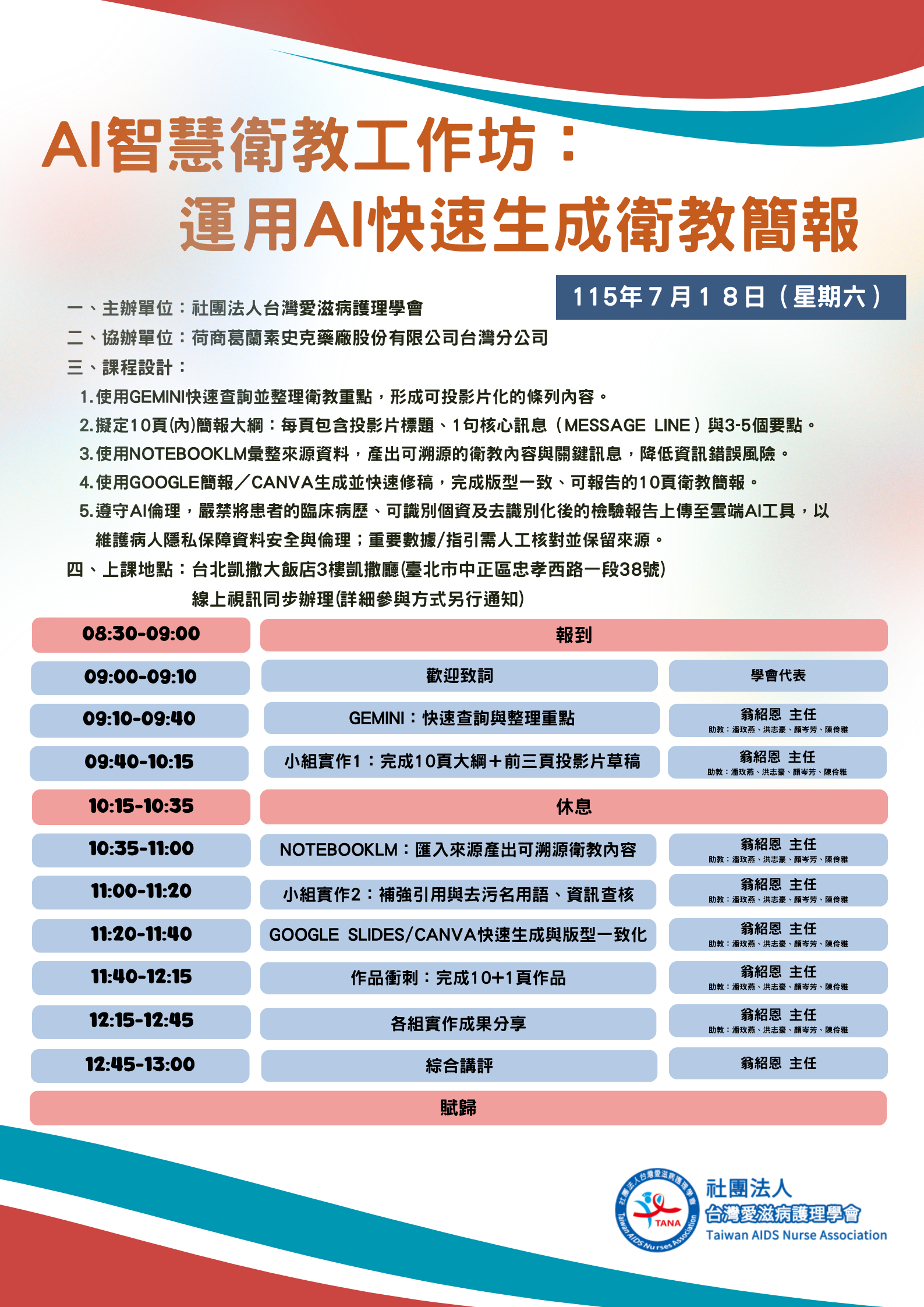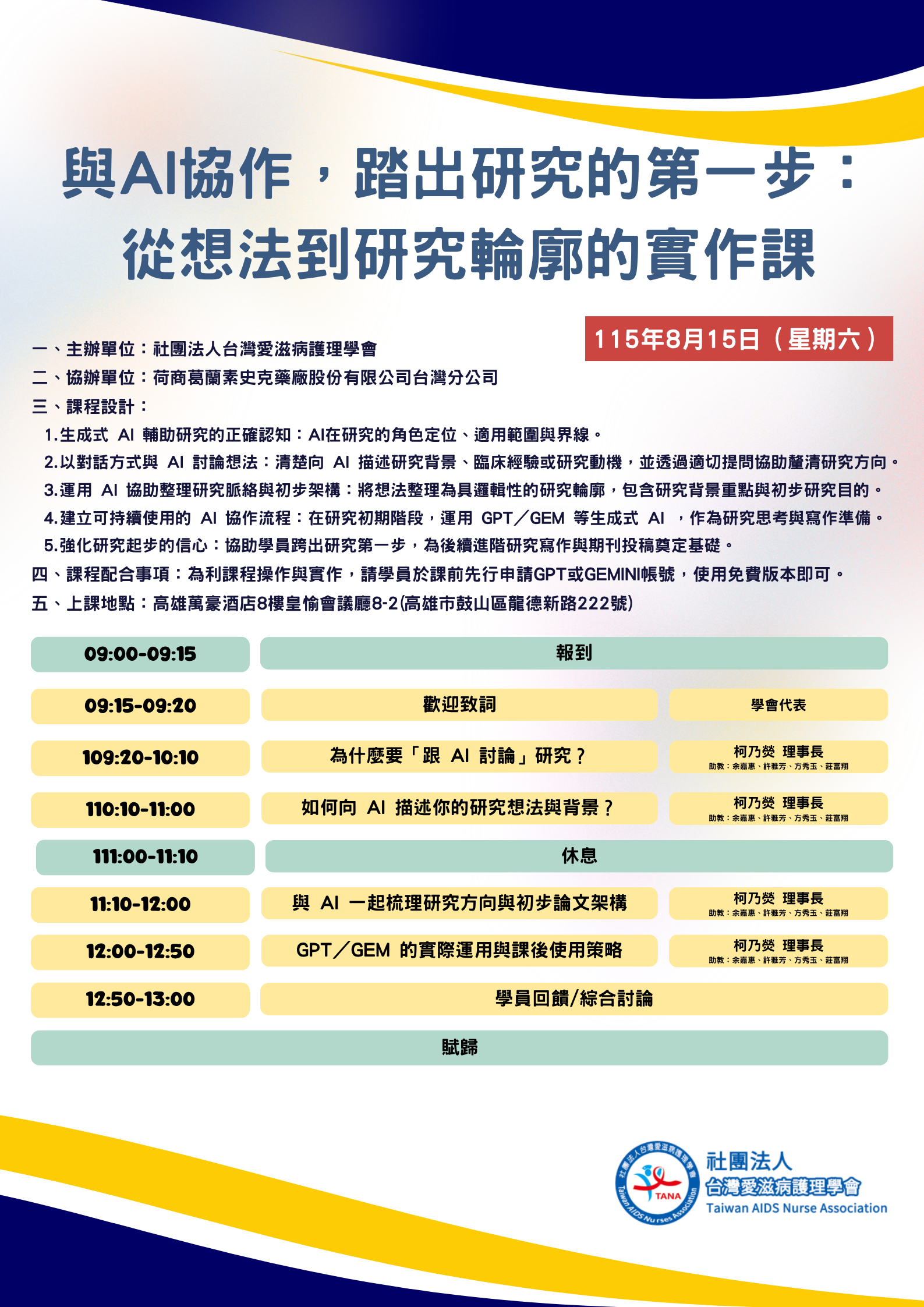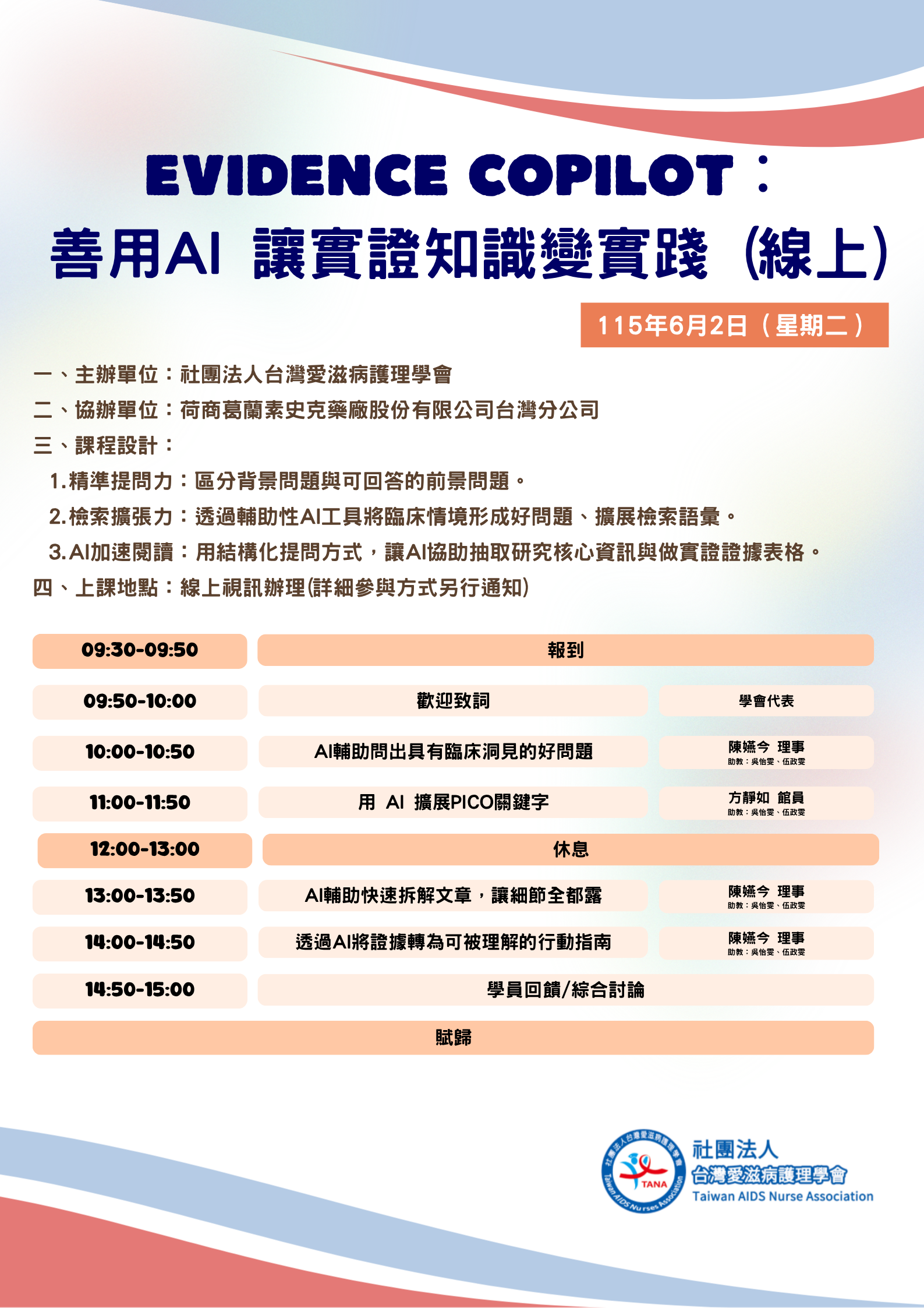 - 2026AI啟航四劍課(非會員早鳥優惠)報名期間:即日起~2026/5/10,請逕自本會官網「 https://www.tananurse.org.tw/SeminarList.aspx?lang=cht 」報名,報名後請務必出席,以確保其他學員權益。若不克出席,請於三日前來信告知取消報名,俾安排學員遞補。